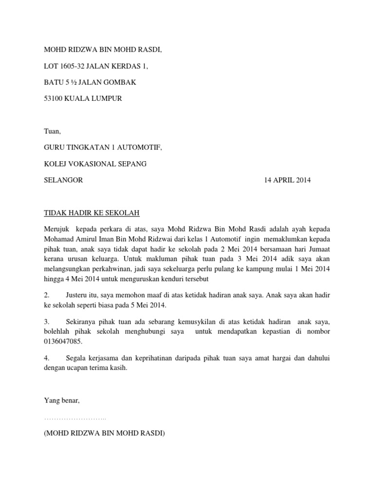 Contoh surat rasmi tidak hadir ke sekolah atas pelbagai alasan munasabah. 8 people like this.sign up to see what your friends like. Contoh format surat rasmi surat tidak hadir ke sekolah. Surat cuti sekolah | berikut saya kongsikan kepada anda contoh surat rasmi untuk memaklumkan kepada guru bahawa anak tidak hadir ke sekolah dengan itu, saya sertakan sekali sijil cuti sakit yang diberikan doktor bagi membolehkan anak saya bercuti sehari. Carian maklumat contoh surat kepada guru kerana tidak hadir atau datang ke sekolah kerana sakit, demam koleksi contoh surat tidak hadir ke sekolah atas pelbagai alasan.